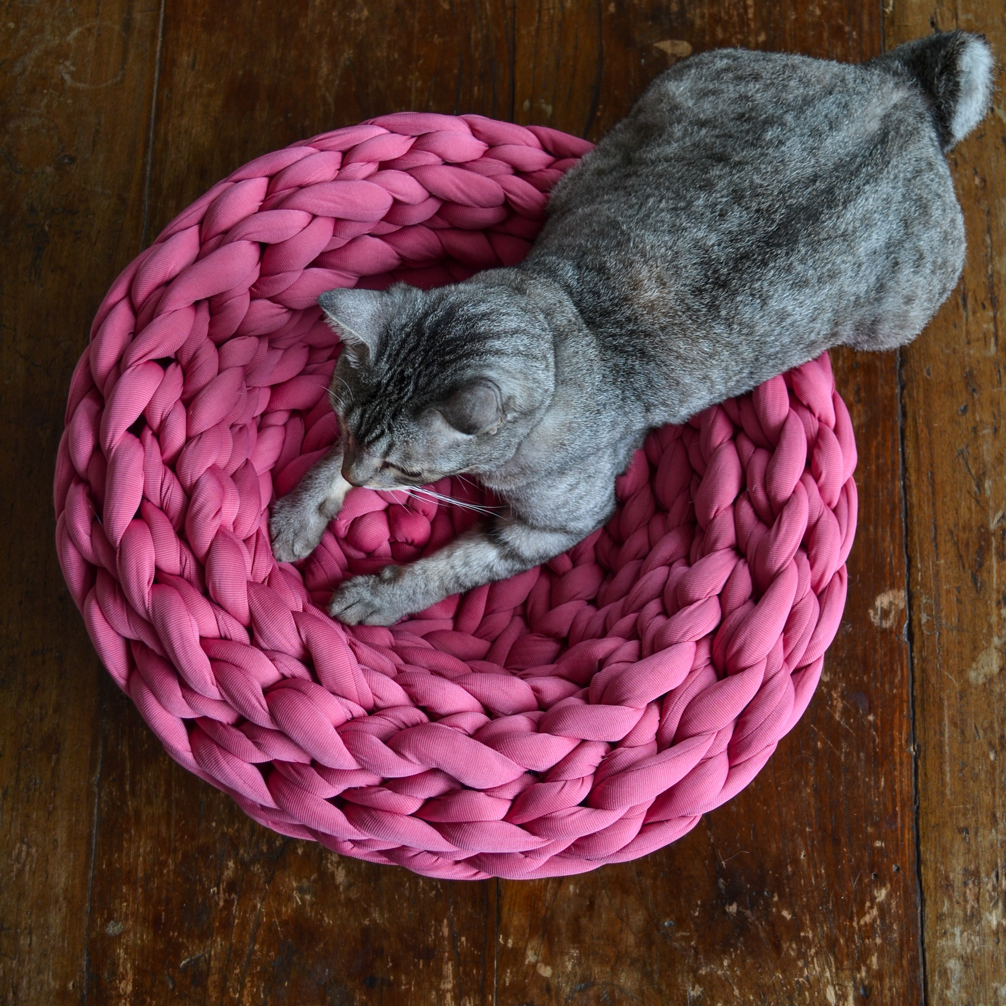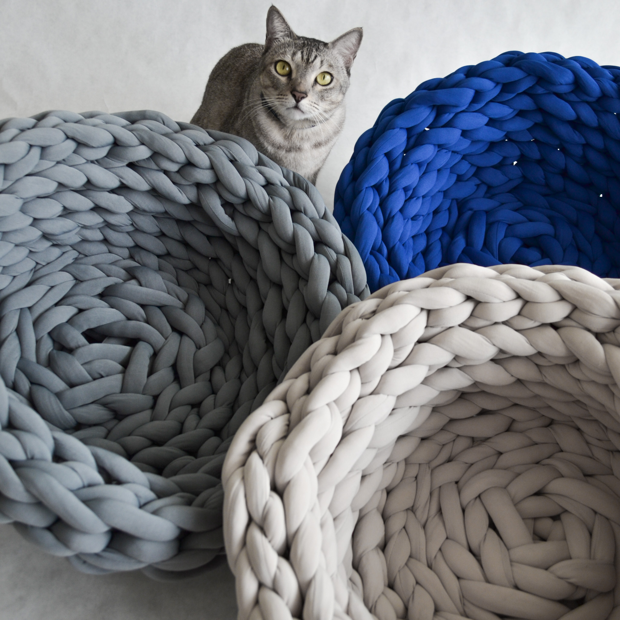Many cats love our weighted blankets just as much as their humans do, so we’ve sanitised, unravelled, and handknitted used blankets into these cute, cosy pet beds.